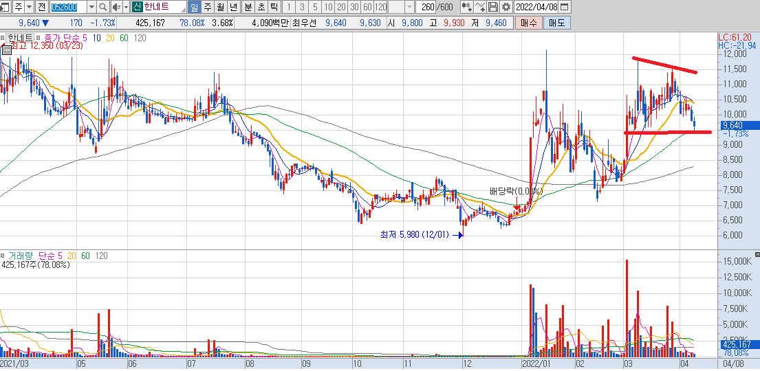한네트의 차트를 보면 상승파동의 저점을 유지를 해주면서 쌍바닥을