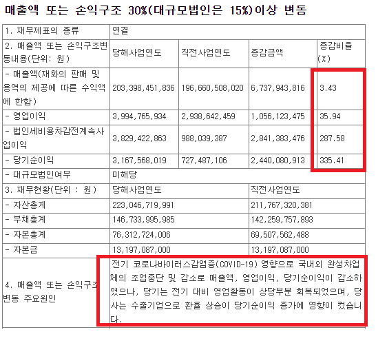 코로나 영향으로 조업 중단 및 감소로 전기의 감소 대비 당기의 상단 부분이