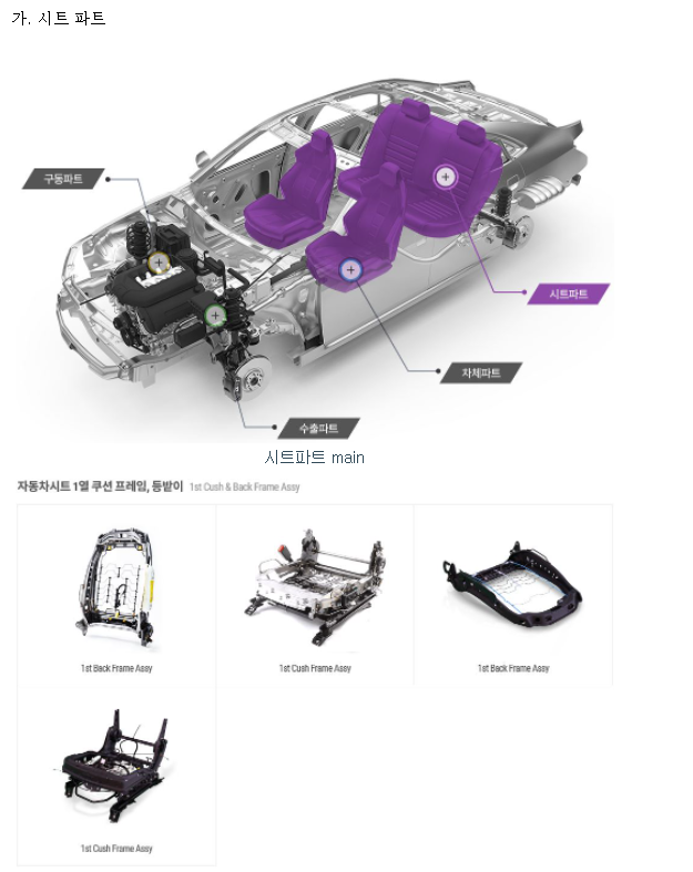 구영테크에서는 시트 파트, 차체 파트, 구동 파트, 수출 파트로 구분되어 현대차에 납품을