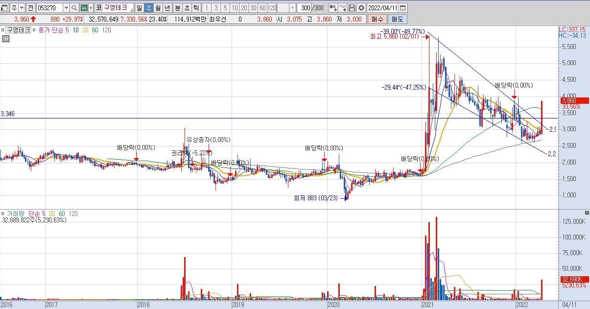 구영테크는 2021년 급등 이후로 계단식 하락을 만든 후에 오늘 급등을 하면서