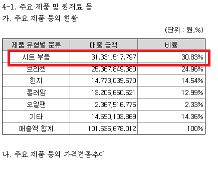 이 중 구영테크의 주요 제품 매출 중 시트부품이 약 31%로 가장 많은 부분을 차지하고 있습니다.