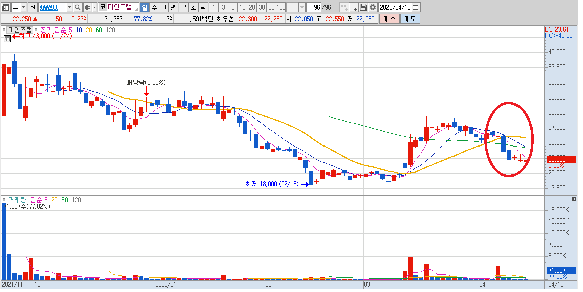 마인즈랩은 신규상장주로서 2021년 11월에 상장을 하고 전고점 밑에서 움직이는