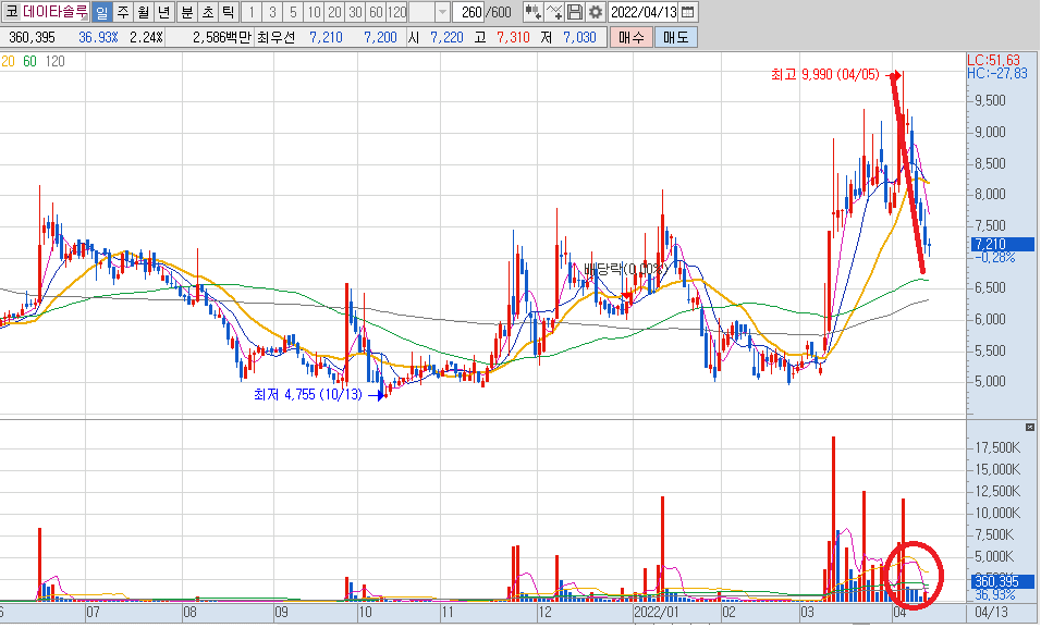 데이타솔루션은 고점 대비 거래대금이 없이 하락을 하는 모습을 보여주면서