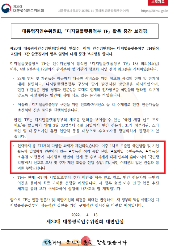오늘 나온 기사의 내용을 보면 디지털 플랫폼 정부 TF는 271개 과제를 제안받았으며,