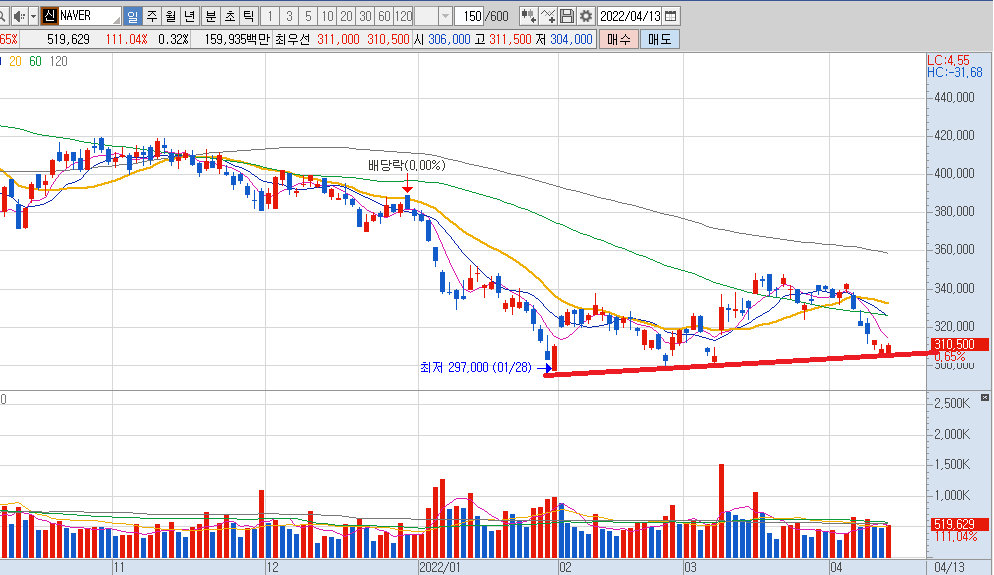 네이버의 차트를 보시면 쓰리바닥을 다져진 모습을 보이고 있습니다.