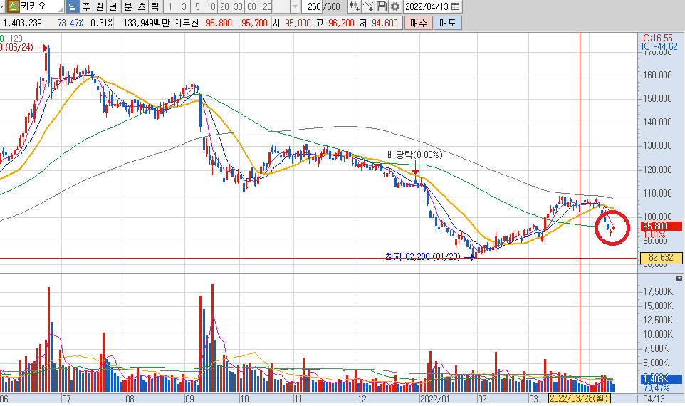 카카오는 반등의 조정을 마치고 밑꼬리를 만들면서 추세 전환의