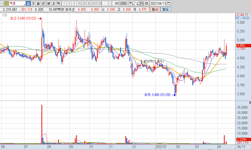 사실 엑셈의 차트는 판단하기 애매한 부분이 있지만 이동평균선의 상태를 보면