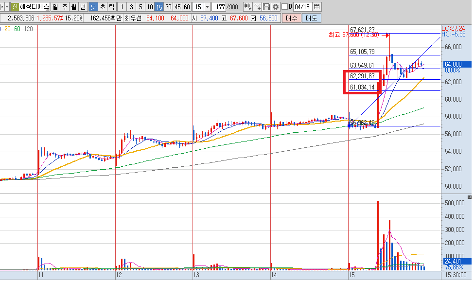 해성디에스는 62,300원 부근에서 1차 매수를 하고,