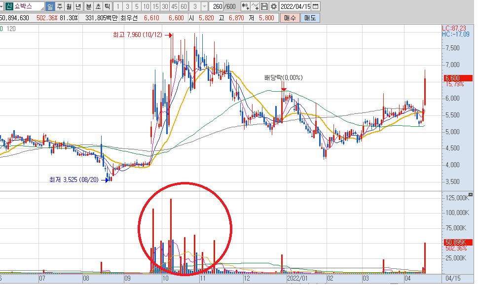 쇼박스는 작년에 상당히 많은 거래대금과 함께 이슈를 받은 전고가의 매물대 있습니다.