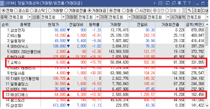 거래대금 상위 종목으로 쇼박스가 7위에 랭크되어 있으며, 거래대금이 3,300억 정도 일어났으며,