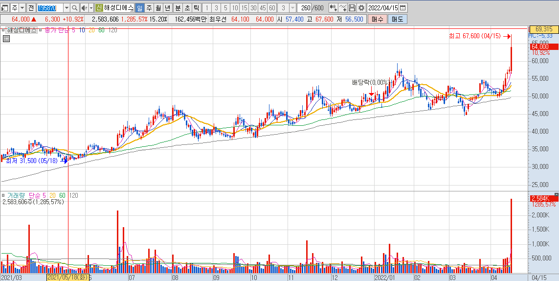 해성디에스는 긴 횡보구간을 거치고 거래대금과 함께 역사적 신고가를