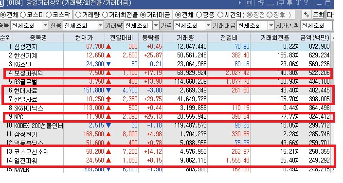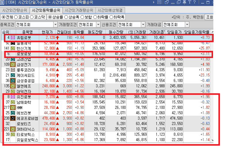 그리고 시간외에서는 로봇 관련주들이 많은 거래대금을 만들면서