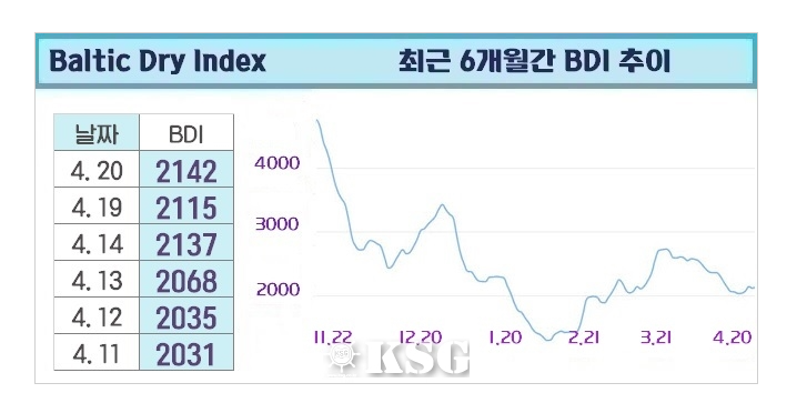 최근 BDI(건화물선 운임지수)는 2142포인트로서 최근 약상승의 모습을