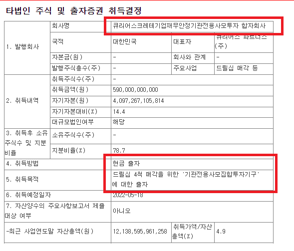 삼성중공업 공시내용을 보면 드릴십 4척 매각을 위해서 '기관전용사모집합투자기구'에 대한
