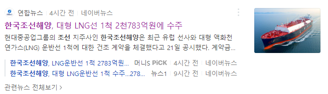 한국조선해양도 대형 LNG선을 1척을 약 2천800억 원에 수주하였다는 소식이 전해졌습니다.