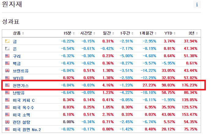 현재 인베스팅 닷컴에 따르면 천연가스 가격은 일간 변동폭이 4.16% 상승으로 거래가 되고 있는 상황입니다.