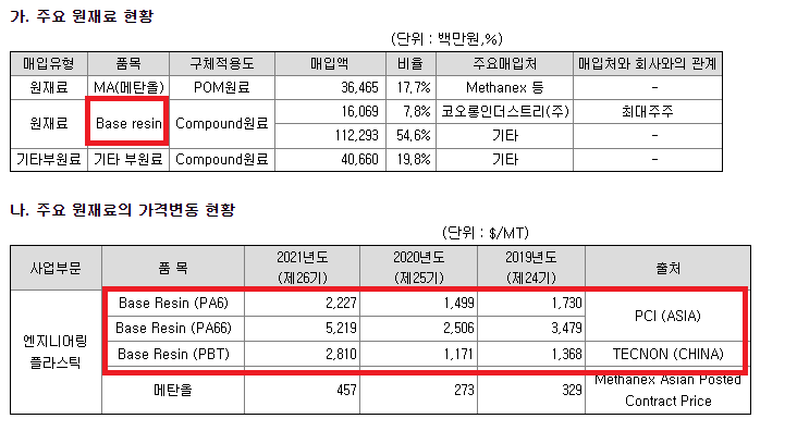코오롱플라스틱의 원재료 현황을 보시면 수지의 비율이 높은 것으로 확인되나 출처에 대한 국가는 아시아와 중국으로 표시되어 있어서 이번 러시아 나프타 관련에 영향이 없을 것으로 봐서는 오히려 더 좋지 않나 생각이 듭니다.