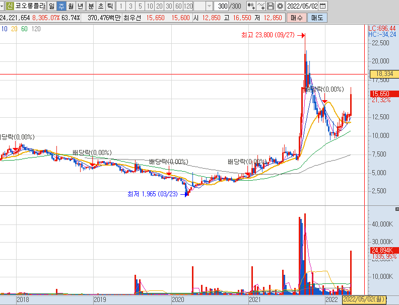 코오롱플라스틱의 주봉 차트를 보시면최대 반등 구간까지는 18,300원 부근이며, 더 상승할 수도 있고, 못 미칠 수도 있으니 상황에 따라 대응을 해야 될 거 같습니다.