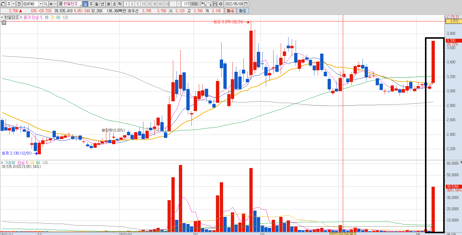 한일단조 일봉차트를 보시면 거래대금과 함께 나온 장대양봉이 출현하면서 전고점에 다다른 모습을 보여주고 있습니다.