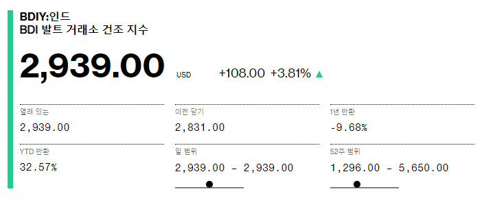 블록버그 BDI(발틱운임지수)를 보면 지속적으로 상승하고 있으며 올해 최고치를 기록한 것으로 해상 운송업종이 상승세를 보이고 있습니다.