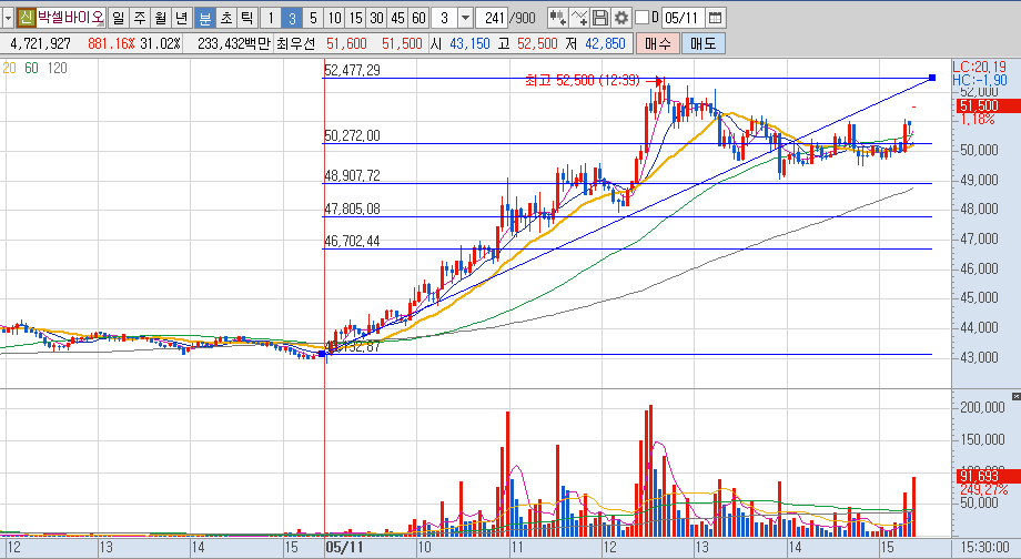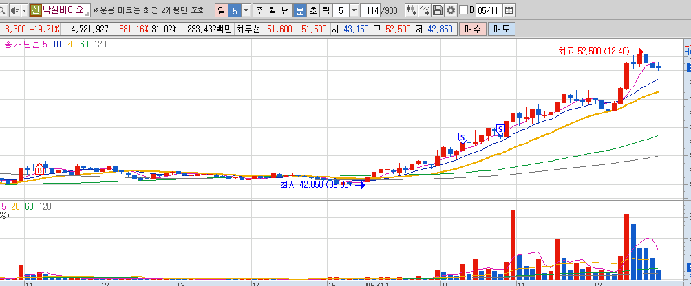 사실 박셀바이오는 5/10 매수하여 오버나잇을 한 종목입니다. 아침에 너무 발매도를 해서 마음이 아팠던 종목으로서 추세전환의 시도를 보이고 있어서 매매를 할 예정입니다. 그렇기 때문에 박셀바이오에 대한 분석을 하려고 합니다.