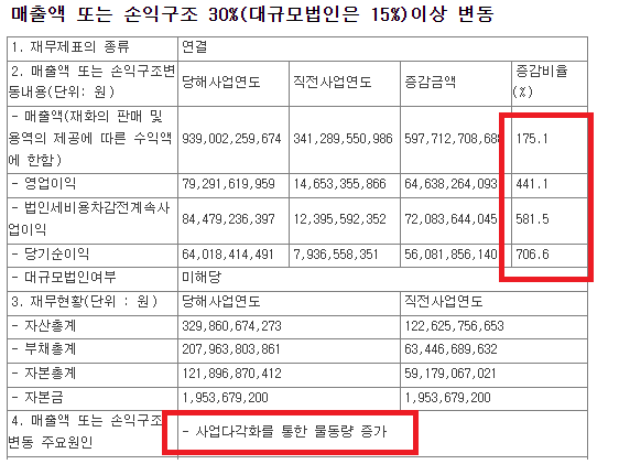 태웅로직스의 실적을 보시면 경이로울정도로 증가세를 보이고 있습니다. 매출액 175% / 영업이익 441% / 당기순이익 706% 증가를 하였으며, 매출액 또는 손익구조 변동 주요 원인으로는 사업다각화를 통한 물동량 증가로 보이고 있습니다.