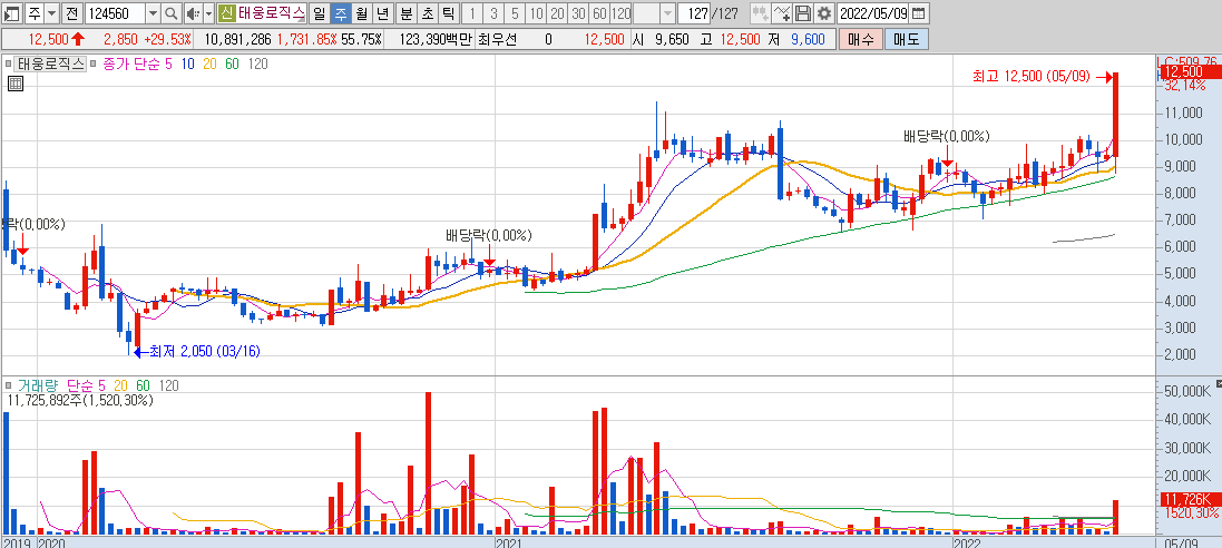 태웅로직스 주봉차트를 보시면 역사적 신고가를 달성을 했으며, 내일이 더 기대되는 차트로 보입니다.