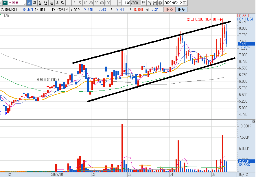 스페코의 일봉차트를 보시면 상승추세파동을 만들면서 박스권을 만들고 있는 상황입니다. 박스권을 돌파하는 상승세가 나올지 박스권을 이탈하는 하락세가 나올지 지켜봐야 하겠지만 제가 들고 있기 때문에 상승세를 기대하는 바입니다!