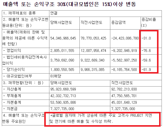 스페코의 매출액 또는 손익구조 변동을 보면 매출액 -31%, 영업이익 -76%, 당기순이익-81% 감소하였으며, 주요원인으로는 글로벌 원자재 가격 상승에 따른 주요 고객사 프로젝트 지연 및 연기에 따른 매출 및 수익성 하락으로 알려지고 있습니다.