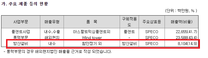 스페코는 대부분의 사업이 플랜트 사업과 풍력부분에서 발생하고 있으며, 방산설비인 함안정기는 약 15% 정도 매출액 비율을 가지고 있습니다.