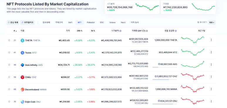 코인마켓캡의 NFT 구분의 시총 상위 코인들을 보시면