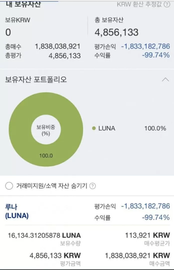 한 온라인 커뮤니티에는 루나에 약 18억정도를 투자한 업비트 캡처 사진이 게재되었으며, 평균단가는 약 11만 원이었습니다. 하지만 5/12일 기준으로 약 300원으로 떨어졌으며, 18억이 480만 원 정도로 떨어져 있는 상태였습니다.