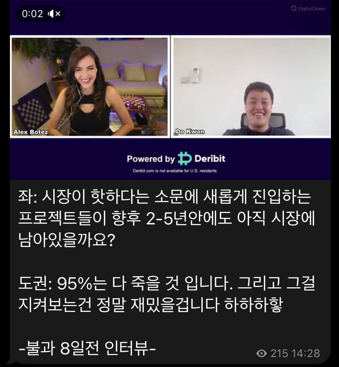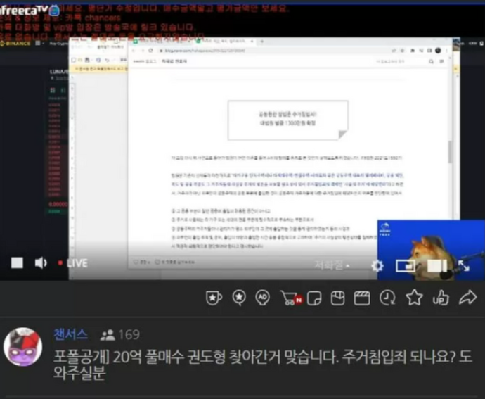 코인 전문 BJ 챈서스는 아프라키 TV 방송을 통해서 자신이 권 대표 자택 집 초인종을 눌렀다고 자수를 한 것으로 보도되고 있습니다. 챈서스는 그동안 투자로 모은 돈 20억 원가량을 루나에 투자한 것으로 알려져 있으며, 자기는 망했다고 밝혔습니다. 집안 침입으로 빨간 줄까지 긋게 생겼다면서 도움을 요청한 상태입니다.