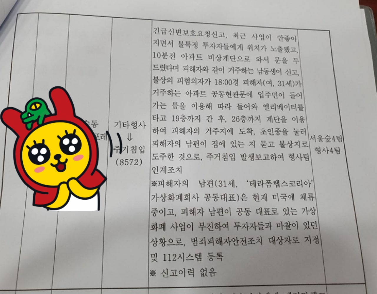 실제로 서울숲4팀 형사 4팀 기록을 보면 주거침입 발생 보고로 인계 조치한 상태라고 나와있습니다.