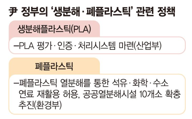 윤석열 대통령 국정과제 중 하나로서 생분해성 플라스틱(PLA) 관련 기준을 마련하고 폐플라스틱 열분해 재활용을 허용한다고 밝혔습니다. 그동안 애매했던 생분해성과 폐플라스틱에 대해 비교적 구체적인 기준이 생김으로써 업계에서는 환영하는 분위기입니다. 글로벌 PLA 시장은 향후 5년 내 3조 원 이상의 규모로 커질 것으로 전망이 나오고 있지만 관련 기준이 모호하여 업계에서는 혼란스러웠던 분위기였습니다. 만약 산업부에서 인증제도를 개편하고 로드맵을 좀 더 적극적으로 펼쳐나간다면 기업들도 투자를 늘릴 것이라는 평가가 있습니다.