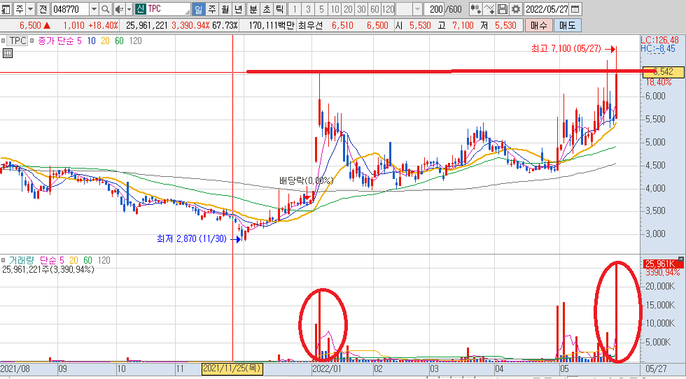 TPC의 일봉 차트를 보시면 최근 거래대금과 함께 일봉상의 전고점을 뚫어주고 저항을 맞은 모습을 볼 수 있습니다. 좋은 추세라고 생각하고 조정을 받으면 새로운 상승추세를 이어갈 것으로 기대가 되고 있는 모습이라서 앞으로 관심 있게 지켜볼 예정입니다.