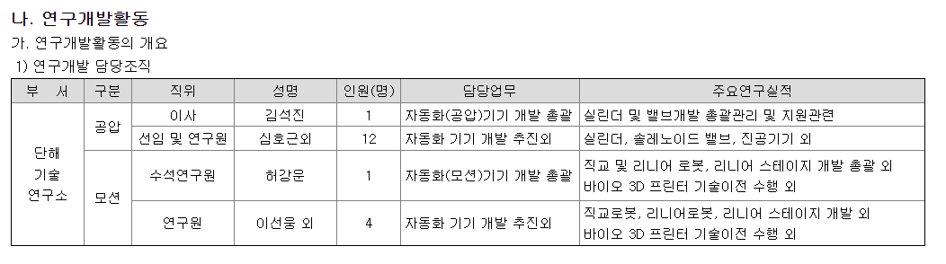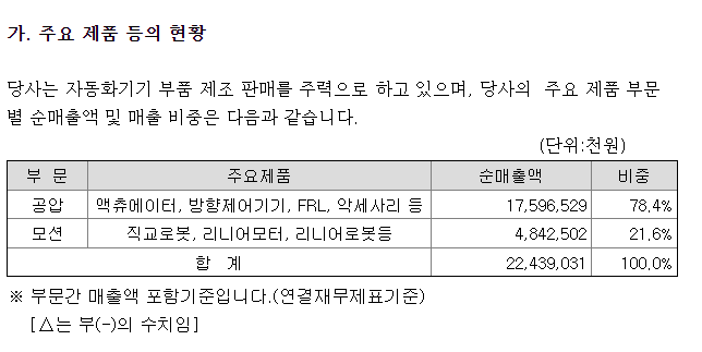 사업보고서 중 주요 제품 등의 현황을 보면 공압과 모션부분에서 매출 비중을 차지고 하고 있습니다.