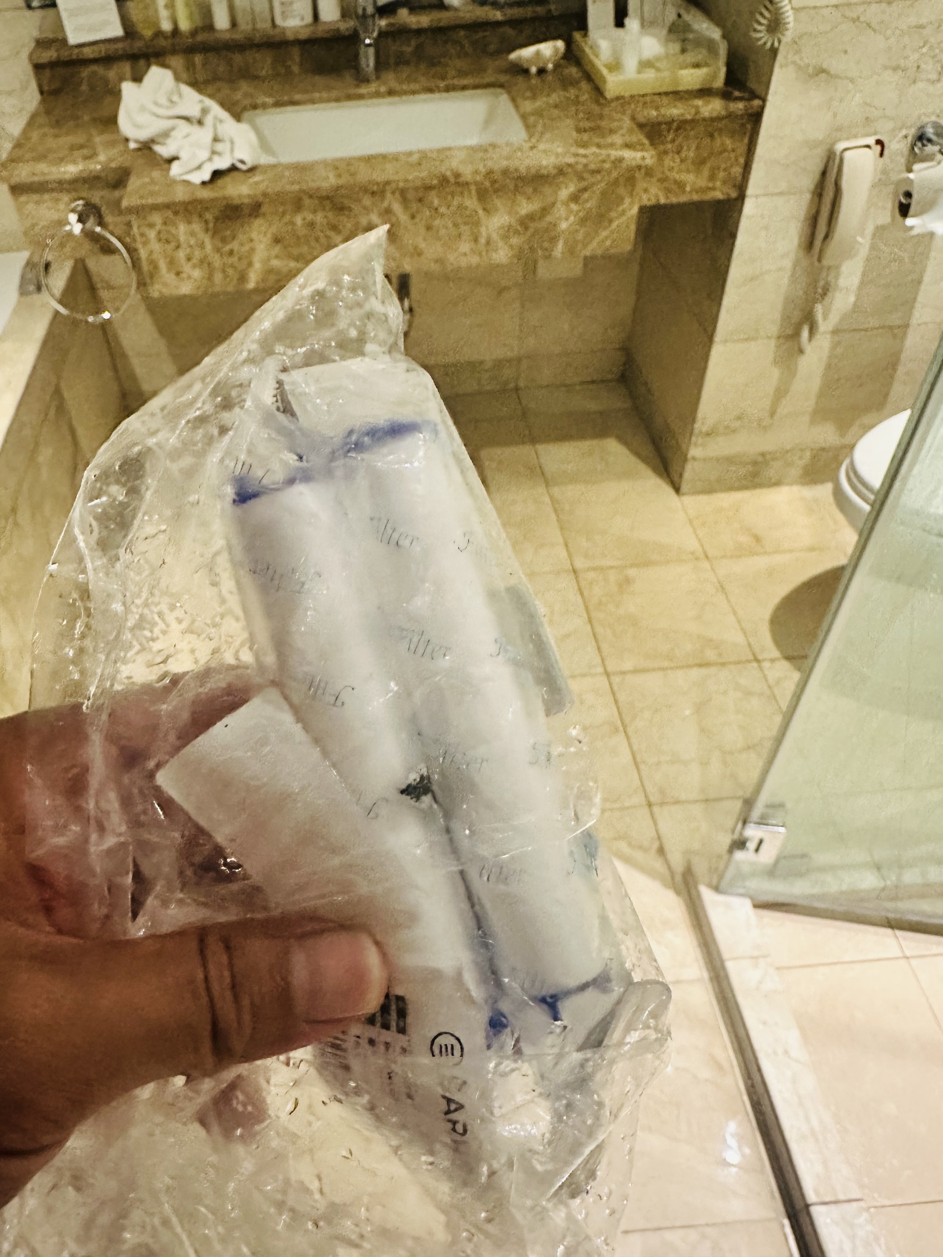 필리핀 수돗물은 우리나라와 다르게 수질관리 수준이 낮아서 일부 오염물질이 포함될 수 있습니다. 그래서 필터를 구매해서 가야 합니다. 2박 묵는 동안 필터가 나중에 정말 더럽게 변했습니다.